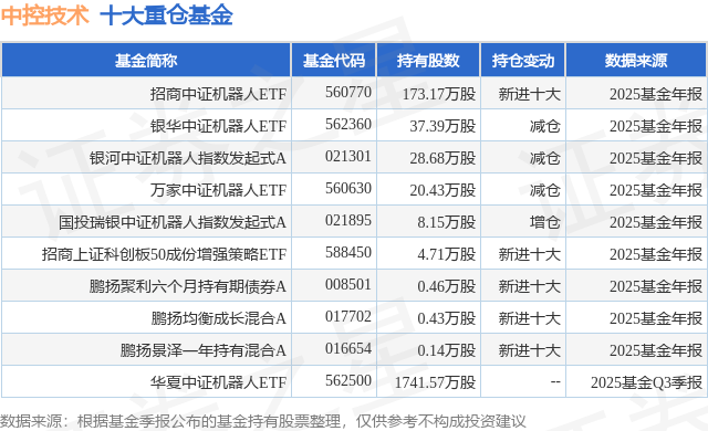 根据2025基金年报公募基金重仓股数据,重仓该股的公募基金共9家,其中持有数量最多的公募基金为招商基金的招商中证机器人ETF。招商中证机器人ETF目前规模为23.19亿元,最新净值1.0803(1月20日),较上一交易日下跌1.26%。该公募基金现任基金经理为许荣漫。许荣漫在任的基金产品包括:招商上证消费80ETF联接A,管理时间为2021年4月22日至今,期间收益率为-27.78%;招商上证消费80ETF,管理时间为2021年4月22日至今,期间收益率为-29.45%;招商国证生物医药指数(LOF)C,管理时间为2021年5月18日至今,期间收益率为-62.64%;招商中证电池主题ETF,管理时间为2021年8月4日至今,期间收益率为-12.95%。